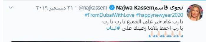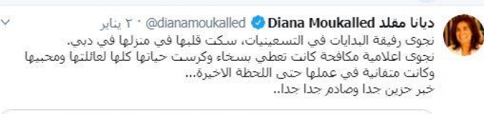 وكانت الإعلامية الراحلة قد كتبت عبر حسابها الرسمي بموقع تويتر، تغريدة قبل يومين من رحيلها، وتحديدا في 31 ديسمبر، قالت فيها: "يارب عام خير على الجميع يارب يارب، يارب احفظ بلادنا وعينك على لبنان".