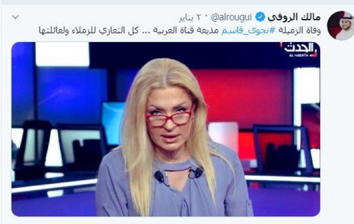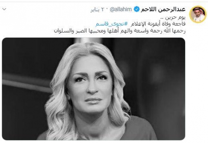 ونعى عدد من أصدقاء الإعلامية الراحلة، عبر صفحاتهم بمواقع التواصل، زميلتهم الراحلة، إذ كتب الإعلامي عبدالرحمن اللاحم، عبر تويتر: "يوم حزين، فاجعة وفاة أيقونة الإعلام نجوى قاسم".