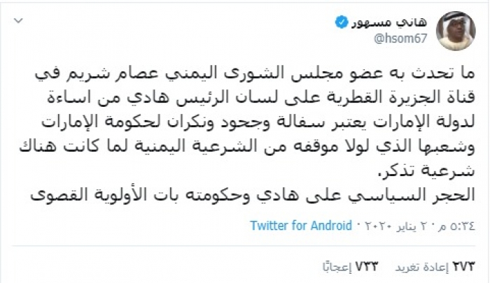 وكتب "مسهور" في تغريدة عبر حسابه الشخصي بتويتر، رصدها "المشهد العربي" قال فيها: "ما تحدث به عضو مجلس الشورى اليمني عصام شريم في قناة الجزيرة القطرية على لسان الرئيس هادي من اساءة لدولة الإمارات يعتبر سفالة وجحود ونكران لحكومة الإمارات وشعبها الذي لولا موقفه من الشرعية اليمنية لما كانت هناك شرعية تذكر".