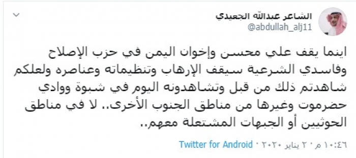 وكتب "الجعيدي" في تغريدة عبر حسابه بتويتر، رصدها "المشهد العربي": "أينما يقف علي محسن وإخوان اليمن في حزب الإصلاح وفاسدي الشرعية سيقف الإرهاب وتنظيماته وعناصره".