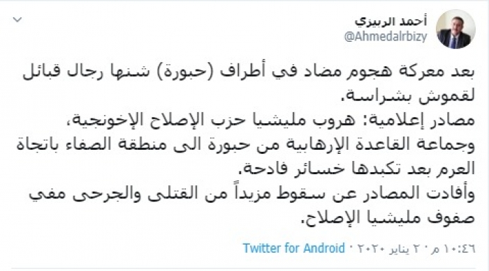 وكتب "الربيزي" في تغريدة عبر حسابه بتويتر، رصدها "المشهد العربي": "بعد معركة هجوم مضاد في أطراف (حبورة) شنها رجال قبائل لقموش بشراسة".