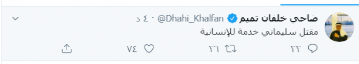 وكتب خلفان عبر "تويتر":" مقتل سليماني من قبل الأمريكان إنقاذ للبشر الذين كان من المؤكد انه كان يخطط للقضاء عليهم...بإرهابه البغيض".