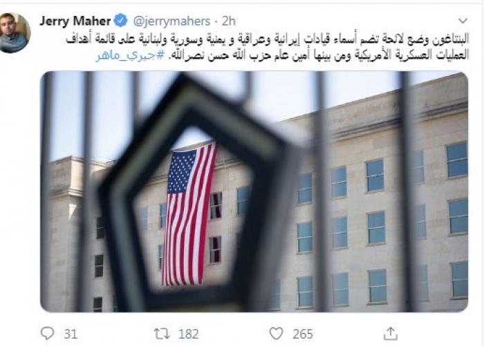 أكد الكاتب الصحفي اللبناني جيري ماهر، اليوم، أن وزارة الدفاع الأمريكية وضعت لائحة تضم العديد من القيادات الإيرانية والعراقية واليمنية والسورية واللبنانية وذلك لاستهدافهم في الفترة المقبلة.