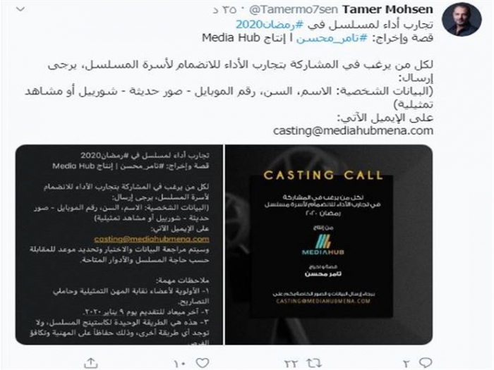 كتب تامر محسن: "تجارب أداء لمسلسل في رمضان 2020، قصة وإخراج تامر_محسن ،إنتاج Media Hub، ولكل من يرغب في المشاركة بتجارب الأداء للانضمام لأسرة المسلسل، يرجى إرسال: