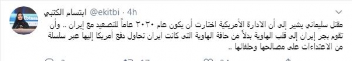 وكتبت في تغريدة عبر "تويتر" رصدها "المشهد العربي": "مقتل سليماني يشير إلى أن الادارة الأمريكية اختارت أن يكون عام ٢٠٢٠ عاماً للتصعيد مع إيران.. وأن تقوم بجر إيران إلى قلب الهاوية بدلاً من حافة الهاوية التى كانت إيران تحاول دفع أمريكا إليها عبر سلسلة من الاعتداءات على مصالحها وحلفائها".