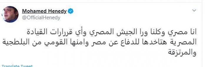 وكتب هنيدي قائلًا :"أنا مصري وكلنا ورا الجيش المصري وأي قرارات القيادة المصرية هتاخدها للدفاع عن مصر وأمنها القومي من البلطجية والمرتزقة".