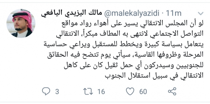 وكتب اليافعي، في تغريدة له عبر موقع التواصل الاجتماعي تويتر، تابعها المشهد العربي: "لو أن المجلس الانتقالي يسير على أهواء رواد مواقع التواصل الاجتماعي لانتهى به المطاف مبكراً".