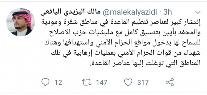 وكتب اليافعي، في تغريدة له عبر موقع التواصل الاجتماعي تويتر، تابعها المشهد العربي: "انتشار كبير لعناصر تنظيم القاعدة في مناطق شقرة ومودية والمحفد بأبين بتنسيق كامل مع مليشيات حزب الإصلاح للسماح لها بدخول مواقع الحزام الأمني واستهدافها، وهناك شهداء من قوات الحزام الأمني بعمليات إرهابية في تلك المناطق التي توغلت إليها عناصر القاعدة.