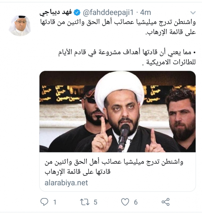 علق المحلل السياسي السعودي فهد ديباجي، على إدراج ميليشيا عصائب أهل الحق واثنين من قادتها على قائمة الإرهاب.