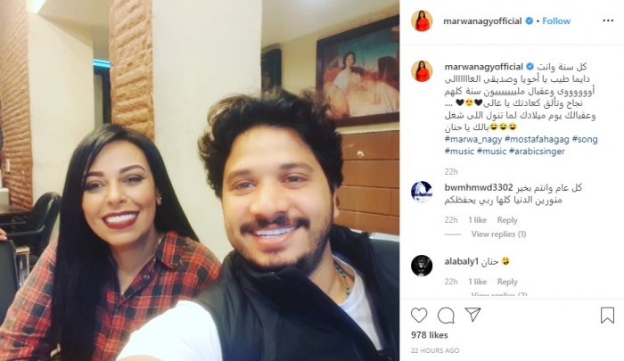 نشرت المطربة مروة ناجي صورة تجمعها بالفنان مصطفى حجاج، عبر حسابها بموقع "إنستجرام"، تهنأه فيها بعيد ميلاده.