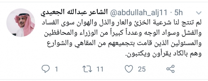 شن الشاعر عبدالله الجعيدي، هجوما لاذعا على حكومة الشرعية ووصفها بشرعية الخزي والعار.