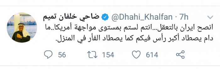 وجه نائب رئيس الشرطة والأمن العام في دبي ضاحي خلفان تميم، نصيحة إلى قيادات إيران، بعد مقتل قائد فيلق القدس اللواء الإيراني قاسم سليماني في ضربة أمريكية، استهدفته يوم أمس الجمعة، قرب مطار بغداد الدولي.