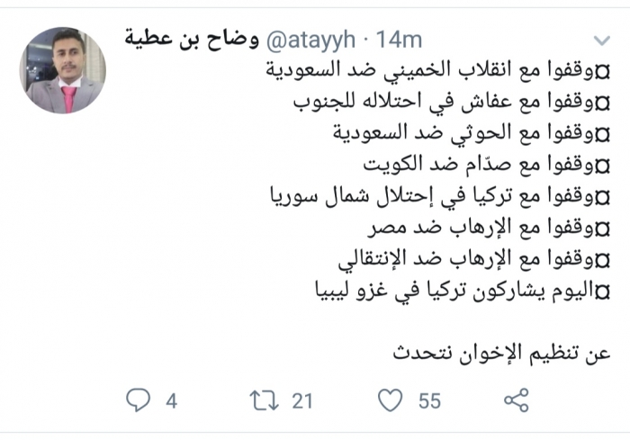 وكتب بن عطية، في تغريدة له عبر موقع التواصل الاجتماعي تويتر، تابعها المشهد العربي: "وقفوا مع انقلاب الخميني ضد السعودية، ووقفوا مع عفاش في احتلاله للجنوب، ووقفوا مع الحوثي ضد السعودية".