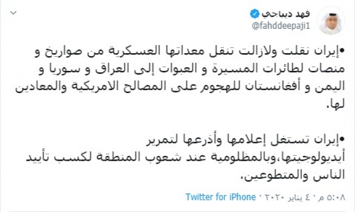 وكتب "ديباجي" في تغريدة بتويتر، رصدها "المشهد العربي" قال فيها: "إيران نقلت ولازالت تنقل معداتها العسكرية من صواريخ و منصات لطائرات المسيرة و العبوات إلى العراق و سوريا و اليمن و أفغانستان للهجوم على المصالح الامريكية والمعادين لها".