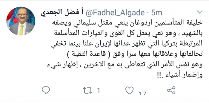 وكتب الجعدي، في تغريدة له عبر موقع التواصل الاجتماعي تويتر، تابعها المشهد العربي: "خليفة المتأسلمين أردوغان ينعي مقتل سليماني ويصفه بالشهيد".