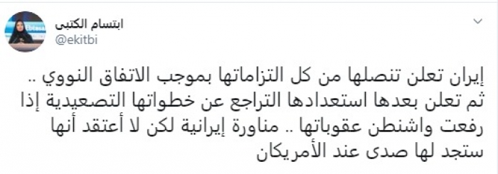وقال في تغريدة عبر "تويتر" رصدها "المشهد العربي": "إيران تعلن تنصلها من كل التزاماتها بموجب الاتفاق النووي.. ثم تعلن بعدها استعدادها التراجع عن خطواتها التصعيدية إذا رفعت واشنطن عقوباتها.. مناورة إيرانية لكن لا أعتقد أنها ستجد لها صدى عند الأمريكان".