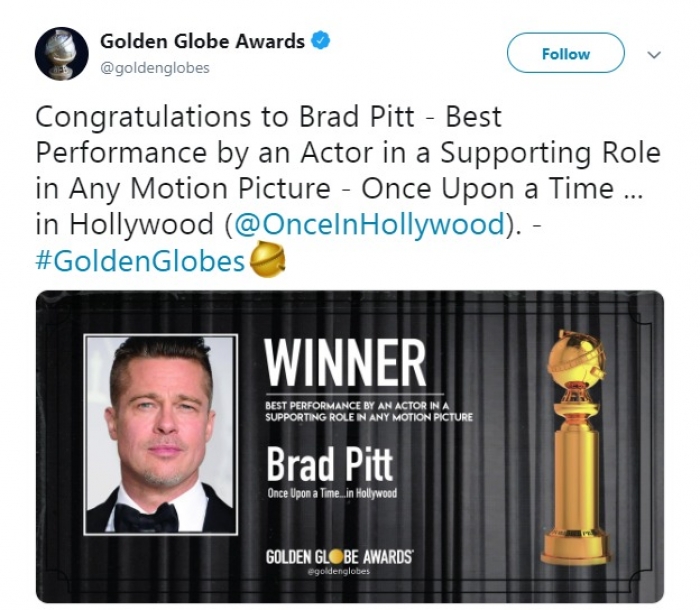 أعلنت الصفحة الرسمية لجوائز جولدن جلوب Golden Globe Awards لعام 2020، على موقع التواصل الاجتماعي "تويتر"، فوز النجم براد بيت، جائزة جولدن جلوب لأفضل ممثل مساعد، عن دوره بفيلم "Once Upon a Time in Hollywood" للمخرج كوينتين تارانتينو.