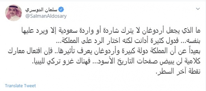 وأضاف: "بعيداً عن أن المملكة دولة كبيرة وأردوغان يعرف تأثيرها.. فإن افتعال معارك كلامية لن يبيض صفحات التاريخ الأسود… فهناك غزو تركي لليبيا. نقطة آخر السطر".
