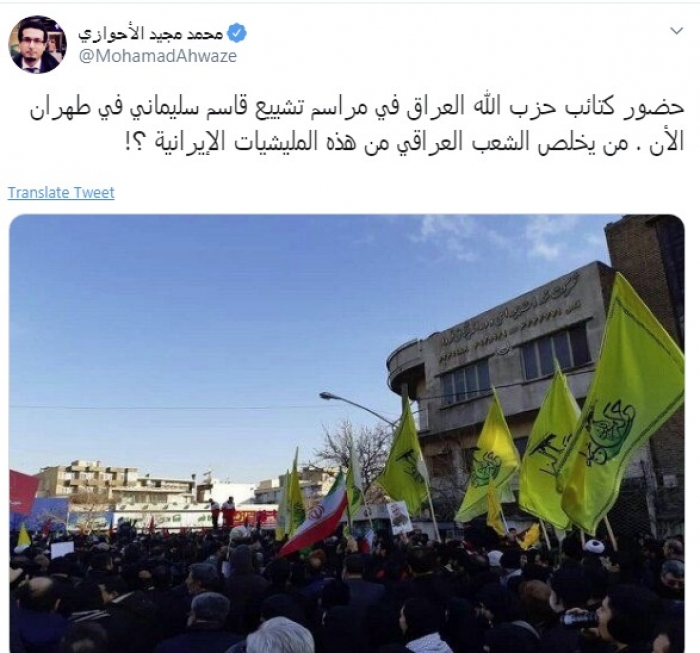 أكد الكاتب الصحفي محمد مجيد الأحوازي، اليوم، أن كتائب حزب الله العراقية حضرت مراسم تشييع قائد فيلق القدس الإيراني قاسم سليماني.