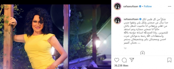 نشرت الفنانة الأردنية صفاء سلطان، عبر حسابها الشخصي في موقع "انستجرام" أول تعليق على حالتها الصحية بعدخضوعها لعملية استئصال الرحم.