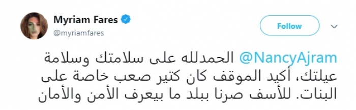 وكتبت ميريام تغريدة، عبر حسابها الرسمي بموقع "إنستجرام":" الحمدلله على سلامتك وسلامة عيلتك، أكيد الموقف كان كتير صعب خاصة على البنات، للأسف صرنا ببلد ما بيعرف الأمن والأمان".