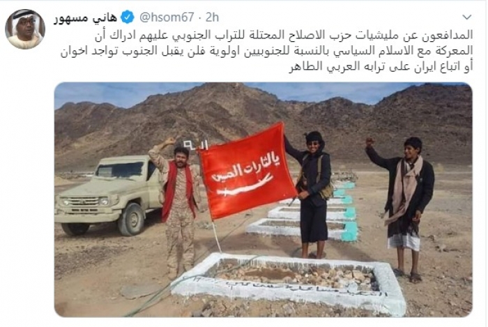 وقال في تغريدة عبر "تويتر" رصدها "المشهد العربي": "المدافعون عن مليشيات حزب الإصلاح المحتلة للتراب الجنوبي عليهم إدراك أن المعركة مع الإسلام السياسي بالنسبة للجنوبيين أولوية فلن يقبل الجنوب تواجد إخوان أو أتباع إيران على ترابه العربي الطاهر".