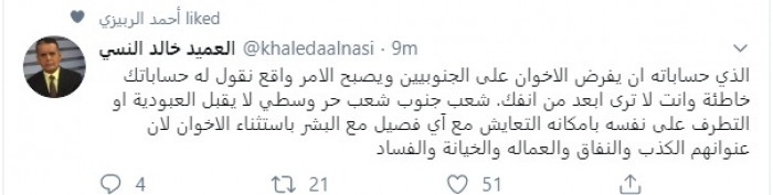 وكتب النسي في تغريدة عبر "تويتر" رصدها "المشهد العربي": "الذي في حساباته أن يفرض الإخوان على الجنوبيين ويصبح الأمر واقع نقول له حساباتك خاطئة وأنت لا ترى أبعد من أنفك. شعب الجنوب شعب حر وسطي لا يقبل العبودية أو التطرف على نفسه بإمكانه التعايش مع أي فصيل من البشر باستثناء الإخوان لأن عنوانهم الكذب والنفاق والعماله والخيانة والفساد".