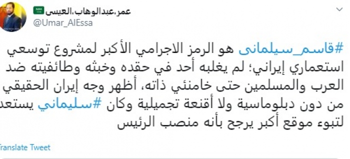 وقال في تغريدة عبر "تويتر" رصدها "المشهد العربي": "قاسم سیلمانی هو الرمز الاجرامي الأكبر لمشروع توسعي استعماري إيراني؛ لم يغلبه أحد في حقده وخبثه وطائفيته ضد العرب والمسلمين حتى خامنئي ذاته، أظهر وجه إيران الحقيقي من دون دبلوماسية ولا أقنعة تجميلية وكان سليماني يستعد لتبوء موقع أكبر يرجح بأنه منصب الرئيس".
