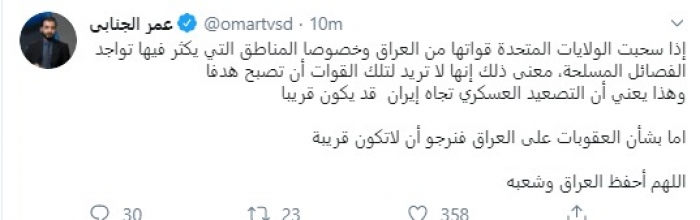 وقال في تغريدة عبر "تويتر" رصدها "المشهد العربي": "إذا سحبت الولايات المتحدة قواتها من العراق وخصوصًا المناطق التي يكثر فيها تواجد الفصائل المسلحة، معنى ذلك إنها لا تريد لتلك القوات أن تصبح هدفاً.. وهذا يعني أن التصعيد العسكري تجاه إيران قد يكون قريبًا".