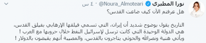 وكتبت المطيري، عبر "تويتر":"هل عرفتم الآن كيف ضاعت القدس؟ التاريخ يقول بوضوح شديد أن إيران، التي تسمي فيلقها الإرهابي بفيلق القدس، هي الدولة الوحيدة التي كانت ترسل لإسرائيل النفط خلال حروبها مع العرب".