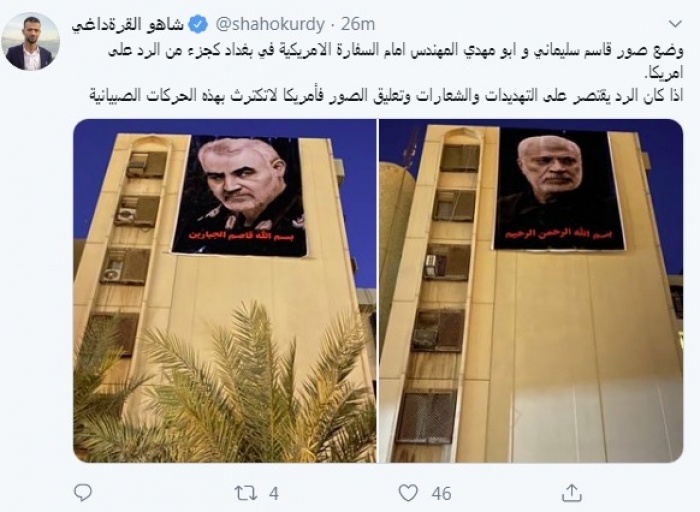 وقال في تغريدة عبر "تويتر" رصدها "المشهد العربي": "وضع صور قاسم سليماني وأبو مهدي المهندس أمام السفارة الأمريكية في بغداد كجزء من الرد على أمريكا. إذا كان الرد يقتصر على التهديدات والشعارات وتعليق الصور فأمريكا لا تكترث بهذه الحركات الصبيانية".