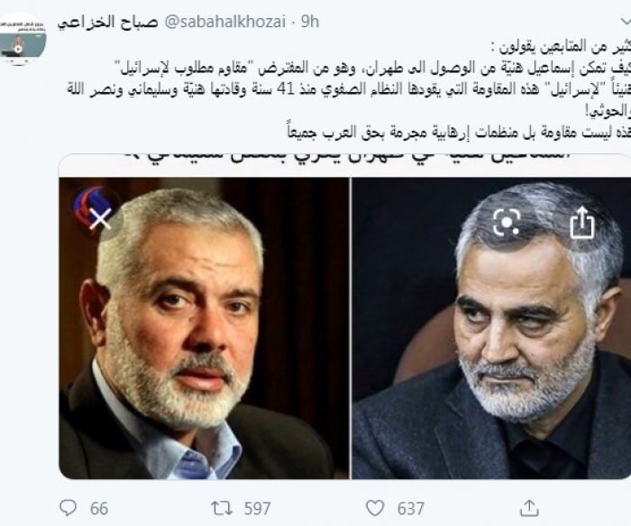 وأضاف: "هنيئاً لإسرائيل هذه المقاومة التي يقودها النظام الصفوي منذ 41 سنة وقادتها هنيّة وسليماني ونصر اللة والحوثي! هذه ليست مقاومة بل منظمات إرهابية مجرمة بحق العرب جميعاً".