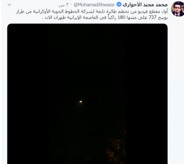 نشر الكاتب الصحفي محمد مجيد الأحوازي، اليوم، أول مقطع لتحطم طائرة تابعة الخطوط الجوية الأوكرانية في طهران.