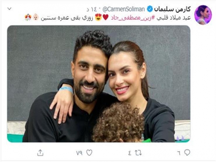 نشرت الفنانه كارمن سليمان عبر حسابها بموقع "تويتر" صورة لها مع زوجها الملحن مصطفى جاد، ونجلها زين.
