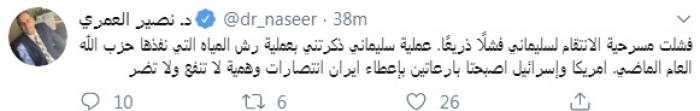 وكتب في تغريدة عبر "تويتر" رصدها "المشهد العربي": "فشلت مسرحية الانتقام لسليماني فشلًا ذريعًا. عملية سليماني ذكرتني بعملية رش المياه التي نفذها حزب الله العام الماضي. أمريكا وإسرائيل أصبحتا بارعاتين بإعطاء ايران انتصارات وهمية لا تنفع ولا تضر".