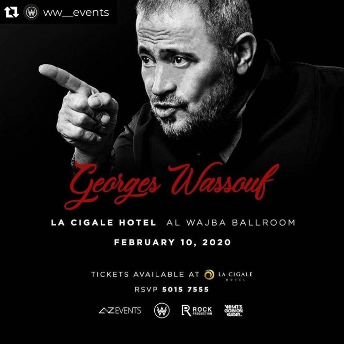 ونشر وسوف "بوستر" دعائيًا للحفل، عبر حسابه بموقع "إنستجرام"، وعلق: "للمرّة الأولى في قطر، حفلة استثنائية للفنان جورج وسوف بانتظاركم في فندق لا سيجال، الدوحة في 10 فبراير 2020".