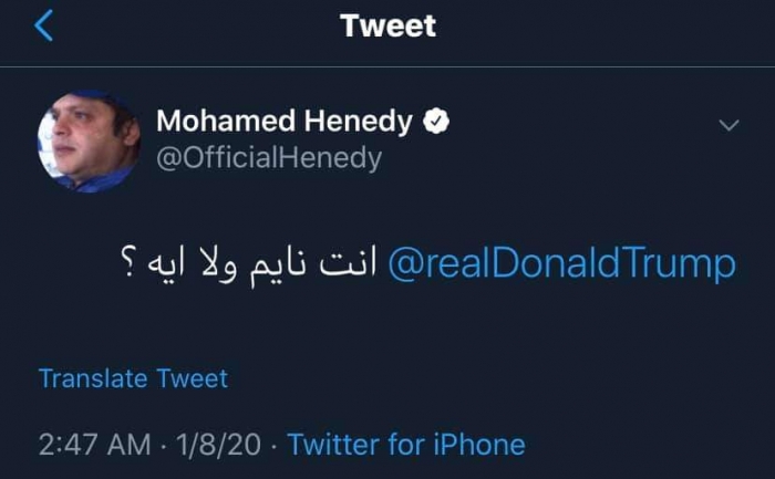 وعلق "هنيدي" عبر حسابه الرسمي بموقع تويتر: "إنت نايم ولا إيه"، وذلك بعد تأخر "ترامب" في الرد على الهجوم الإيراني.
