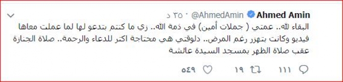 وغرد "أمين": "البقاء لله.. عمتي ( جملات أمين) في ذمة الله.. زي ما كنتم بتدعو لها لما عملت معاها فيديو وكانت بتهزر رغم المرض.. دلوقتي هي محتاجة اكتر للدعاء والرحمة".