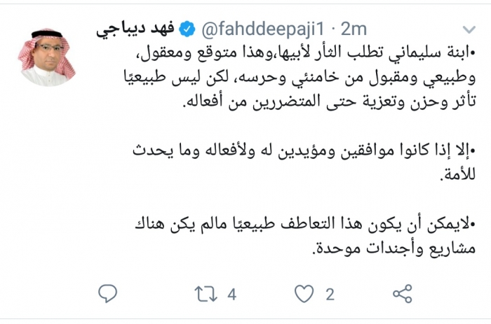 وكتب ديباجي، في تغريدة له عبر موقع التواصل الاجتماعي تويتر، تابعها المشهد العربي: "ابنة سليماني تطلب الثأر لأبيها، وهذا متوقع ومعقول، وطبيعي ومقبول من خامنئي وحرسه، لكن ليس طبيعيًا تأثر وحزن وتعزية حتى المتضررين من أفعاله، إلا إذا كانوا موافقين ومؤيدين له ولأفعاله وما يحدث للأمة".