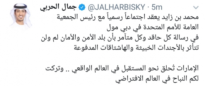وكتب الحربي، في تغريدة له على موقع التواصل الاجتماعي تويتر، تابعها المشهد العربي: "محمد بن زايد يعقد اجتماعاً رسمياً مع رئيس الجمعية العامة للأمم المتحدة في دبي مول، في رسالة لكل حاقد وكل متآمر بأن بلد الأمن والأمان لم ولن تتأثر بالأجندات الخبيثة والهاشتاقات المدفوعة".