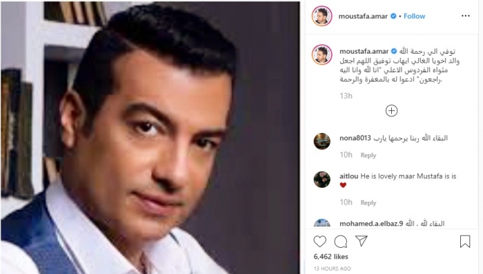 دعا الفنان مصطفى قمر لوالد صديقه الفنان إيهاب توفيق، الذي توفي صباح اليوم الخميس، إثر اختناقه نتيجة حريق نشب في فيلته بمدينة نصر، حيث نشر صورة لإيهاب توفيق عبر حسابه الشخصي على "إنستجرام" ليواسيه، وعلق عليها قائلًا: "توفى إلى رحمة الله والد أخويا الغالي إيهاب توفيق اللهم اجعل مثواه الفردوس الأعلى أنا لله وانا إليه راجعون ادعوا له بالمغفرة والرحمة".