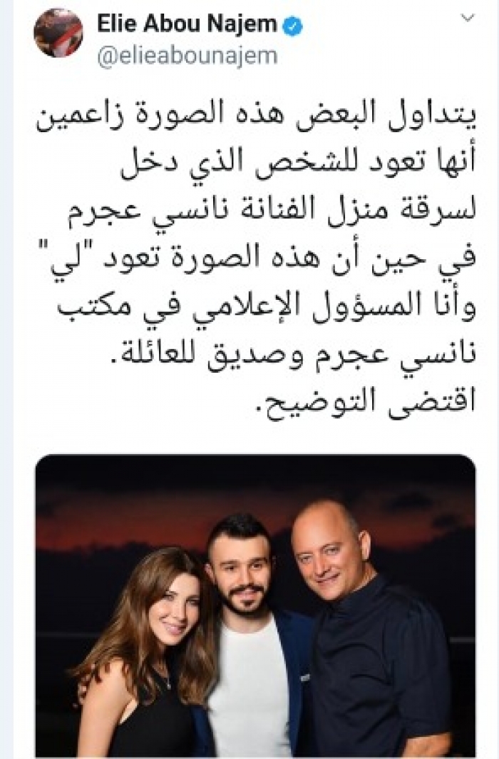 وكتب إيلي بر حسابه بموقع تويتر :"يتداول البعض هذه الصورة زاعمين أنها تعود للشخص الذي دخل لسرقة منزل الفنانة نانسي عجرم في حين أن هذه الصورة تعود “لي” وأنا المسؤول الإعلامي في مكتب نانسي عجرم وصديق للعائلة، لذلك اقتضى التوضيح".