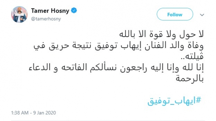 وكتب تامر حسنى، عبر حسابه على تويتر، قائلا: "لا حول ولا قوة إلا بالله وفاة والد الفنان إيهاب توفيق نتيجة حريق فى فيلته.. إنا لله وإنا إليه راجعون نسألكم الفاتحه والدعاء بالرحمة".