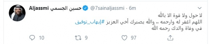 وكتب حسين الجسمى، عبر حسابه على تويتر، قائلا "لا حول ولا قوة إلا بالله اللهم اغفر له وارحمه والله يصبرك أخى العزيز إيهاب توفيق فى وفاة والدك رحمه الله".