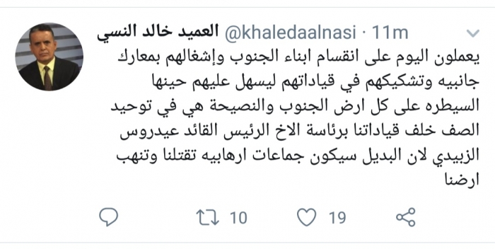 وكتب النسي، في تغريدة له على موقع التواصل الاجتماعي تويتر، تابعها المشهد العربي: "يعملون اليوم على انقسام أبناء الجنوب وإشغالهم بمعارك جانبية وتشكيكهم في قياداتهم ليسهل عليهم حينها السيطرة على كل أرض الجنوب".