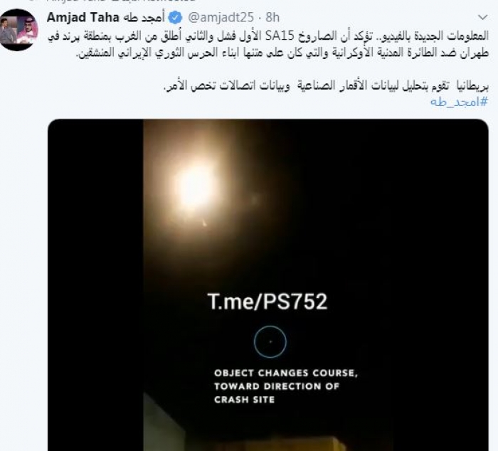 وقال في تغريدة عبر "تويتر" رصدها "المشهد العربي": "المعلومات الجديدة بالفيديو.. تؤكد أن الصاروخ SA15 الأول فشل والثاني اُطلق من الغرب بمنطقة پرند في طهران ضد الطائرة المدنية الأوكرانية والتي كان على متنها أبناء الحرس الثوري الإيراني المنشقين".