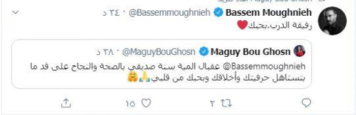 نشرت الفنانة اللبنانية ماجي بو غصن عبر حسابها الشخصي بموقع "تويتر" تغريدة تهنئ بها الفنان والمخرج باسم مغنية بعيد ميلاده.