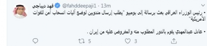 وقال في تغريدة عبر "تويتر" رصدها "المشهد العربي": "رئيس الوزراء العراقي بعث برسالة إلى بومبيو يطلب إرسال مندوبين لوضع آليات انسحاب آمن للقوات الأمريكية عادل عبدالمهدي يقوم بالدور المطلوب منه والمفروض عليه من إيران".