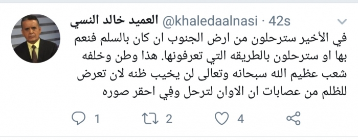 وكتب النسي، في تغريدة له على موقع التواصل الاجتماعي تويتر، تابعها المشهد العربي: "في الأخير سترحلون من أرض الجنوب إن كان بالسلم فنعم بها أو سترحلون بالطريقة التي تعرفونها".