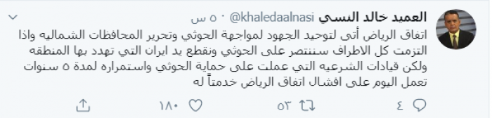 وكتب النسي عبر "تويتر":"اتفاق الرياض أتى لتوحيد الجهود لمواجهة الحوثي وتحرير المحافظات الشمالية".